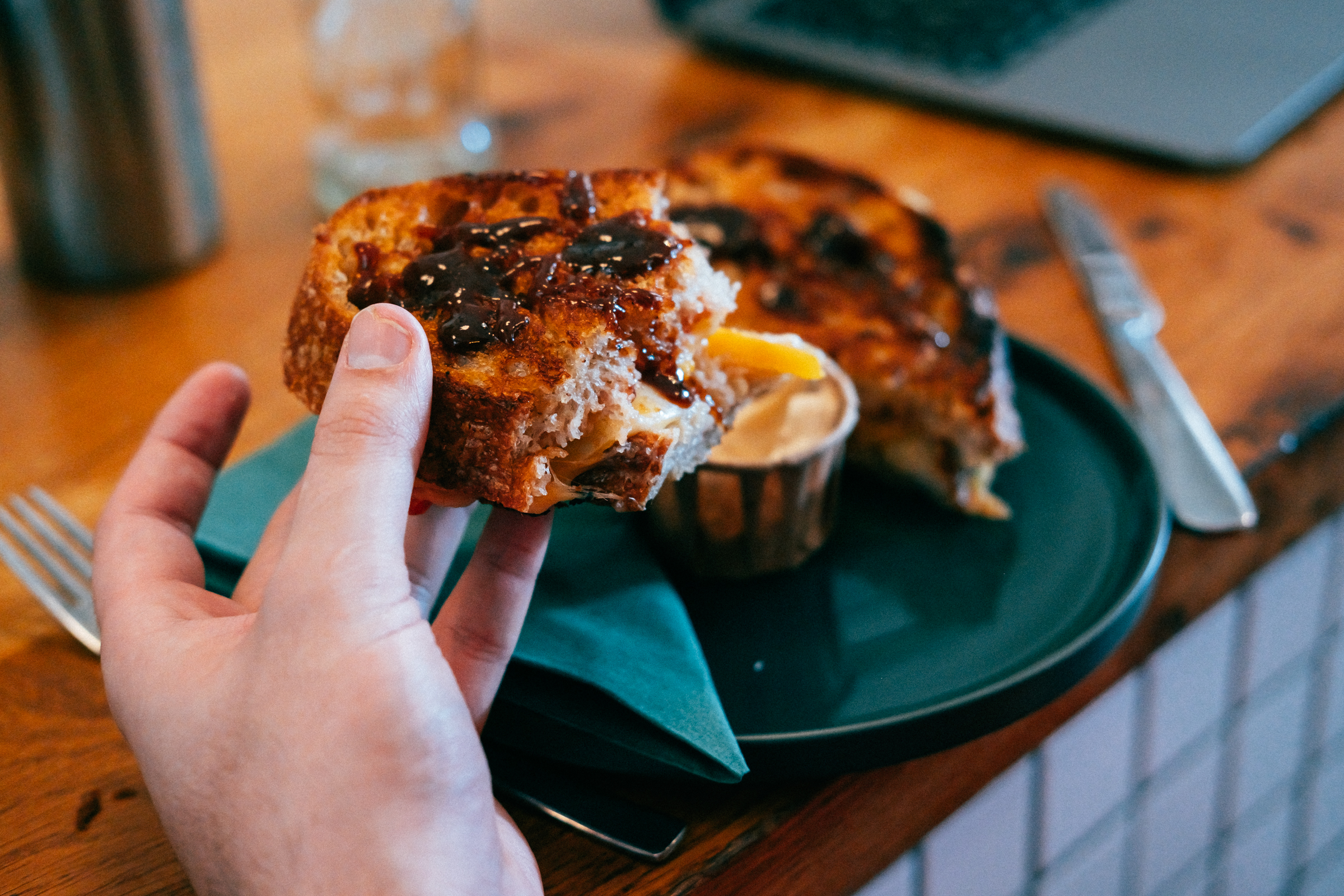 Twee sneetjes blond zuurdesem brood, met paprika, rode ui, boerenkaas en pittige tomatenchutney. Gebakken in de pan.